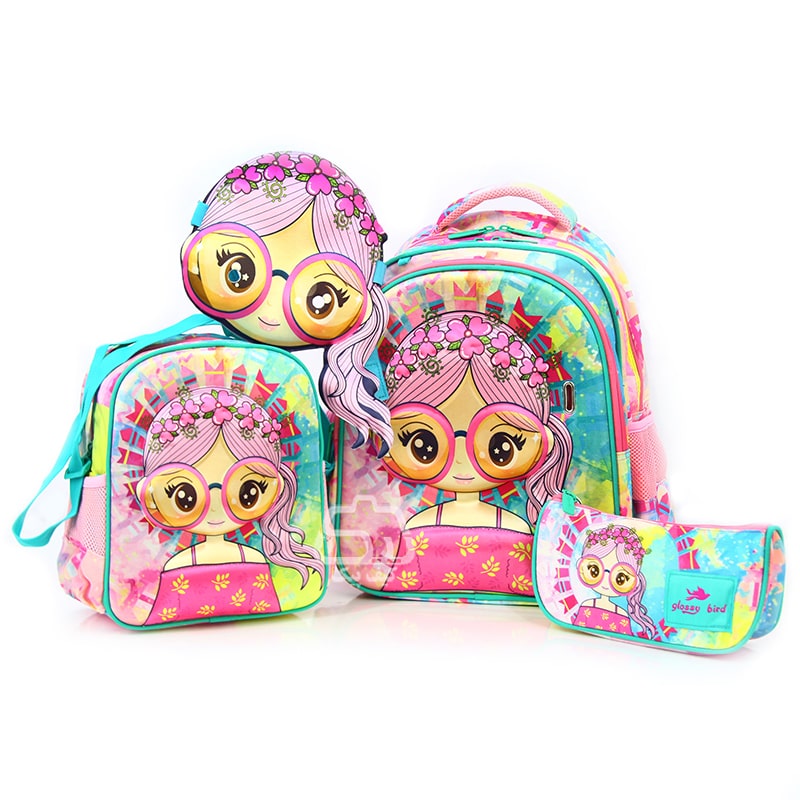 کوله پشتی مدرسه دخترانه glossy bird کد HA202A چهار تکه نقابدار